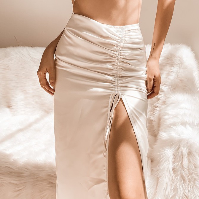 Chân váy trắng xẻ tà rút dây sang chảnh - Sản phẩm may 2 lớp, không lo mỏng free ship